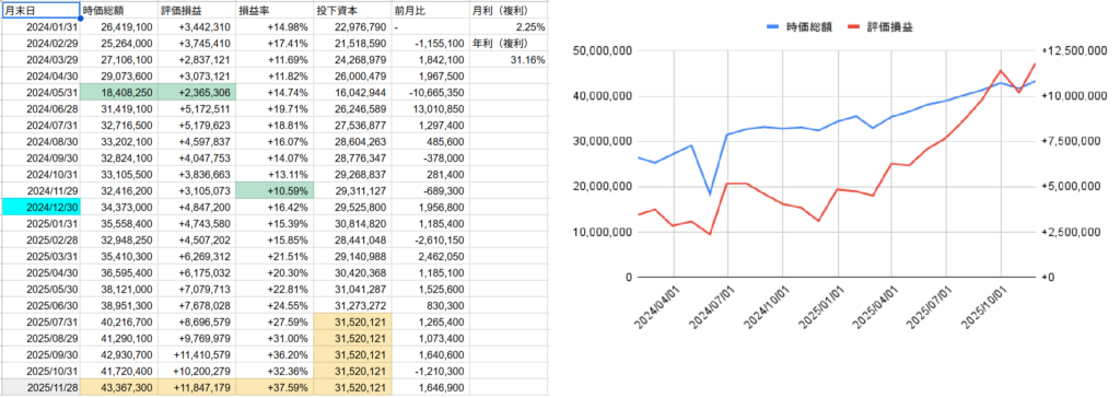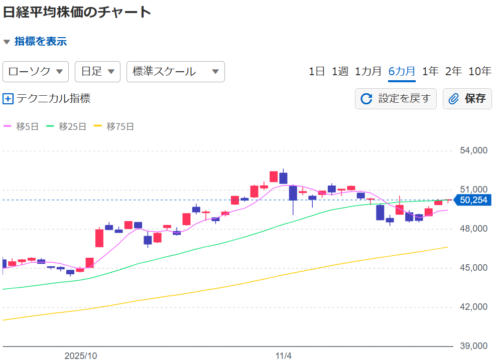 日経平均を見ると、9月末に 45,000円 だったのが、11月末はなんと 50,254円 となっていました。